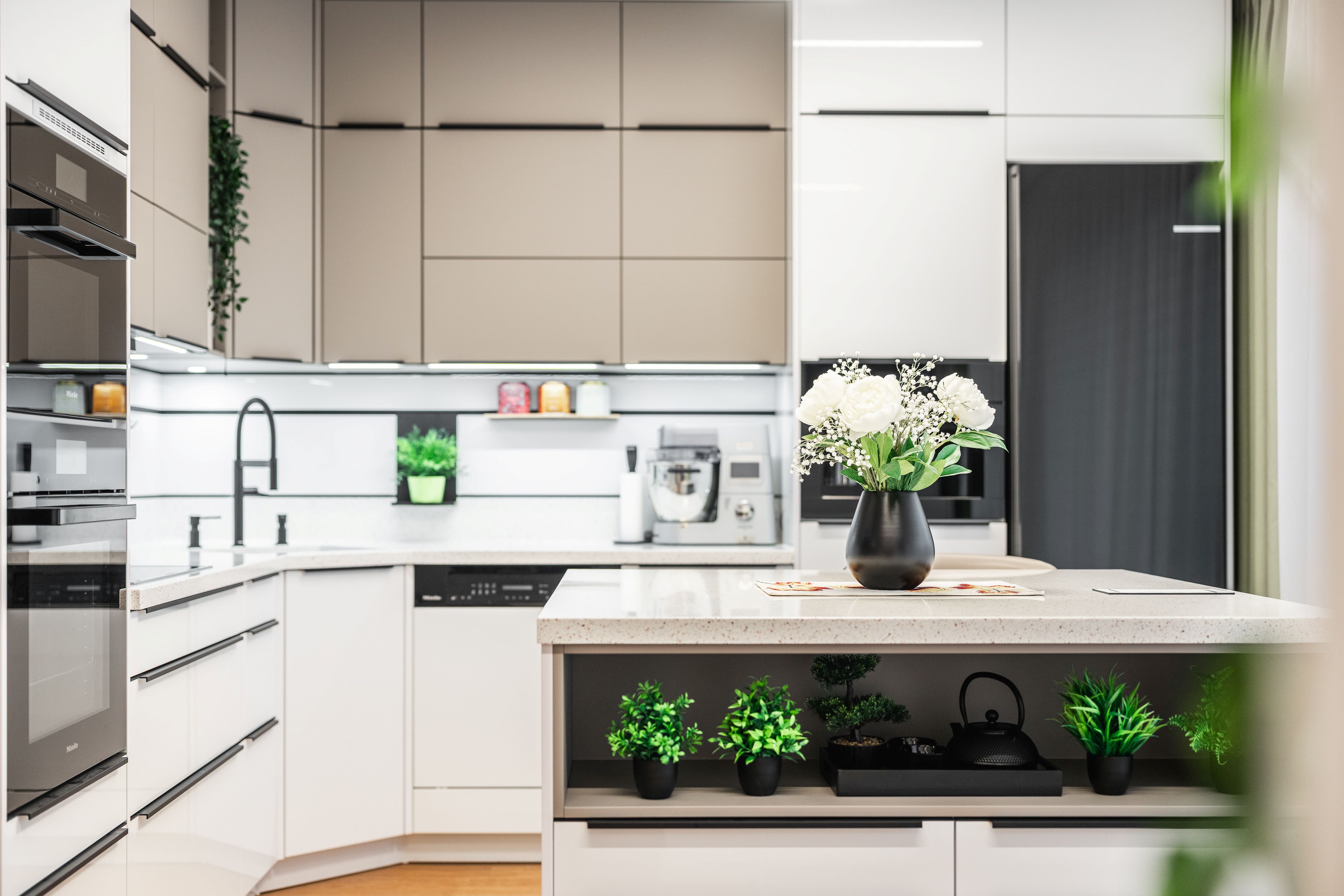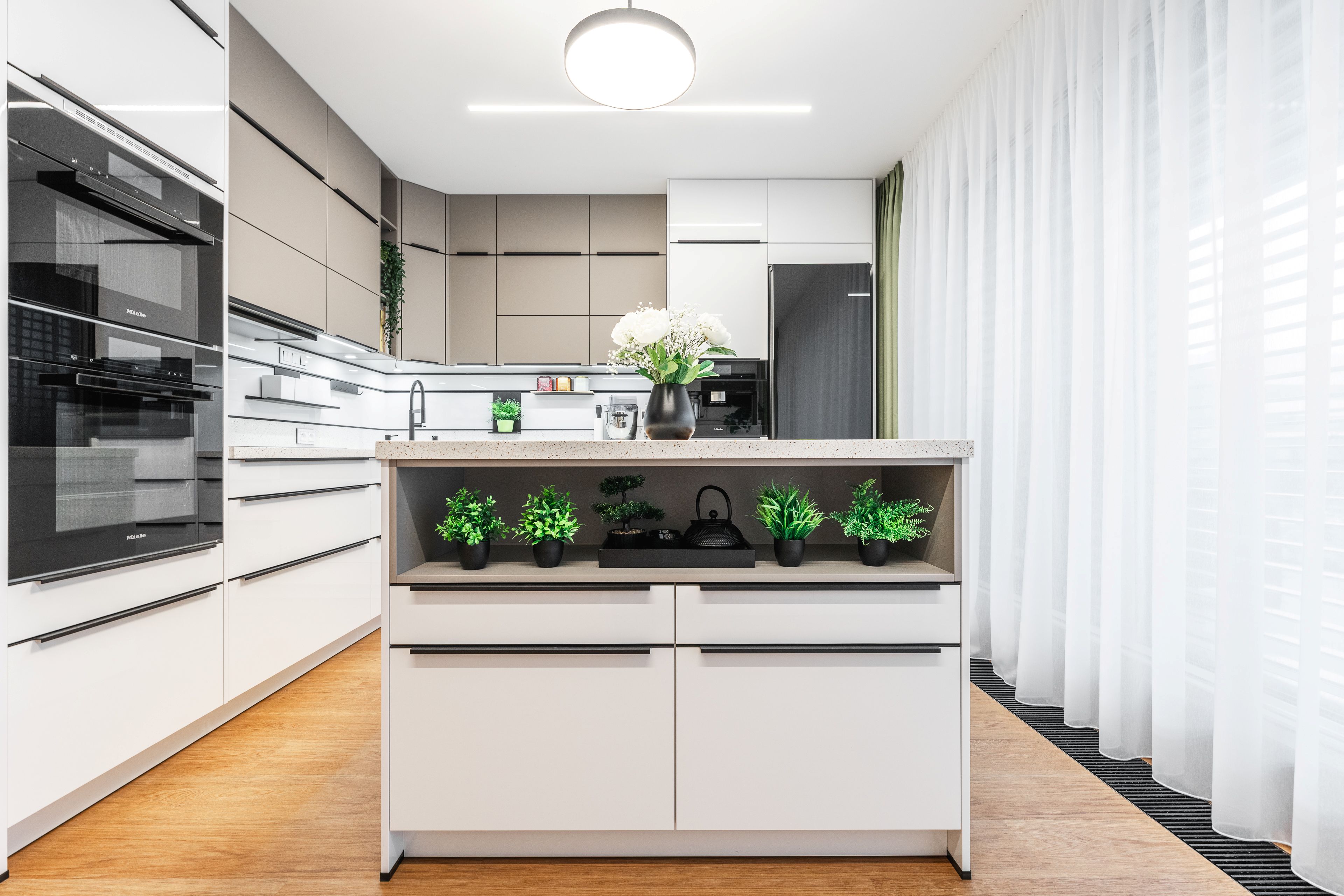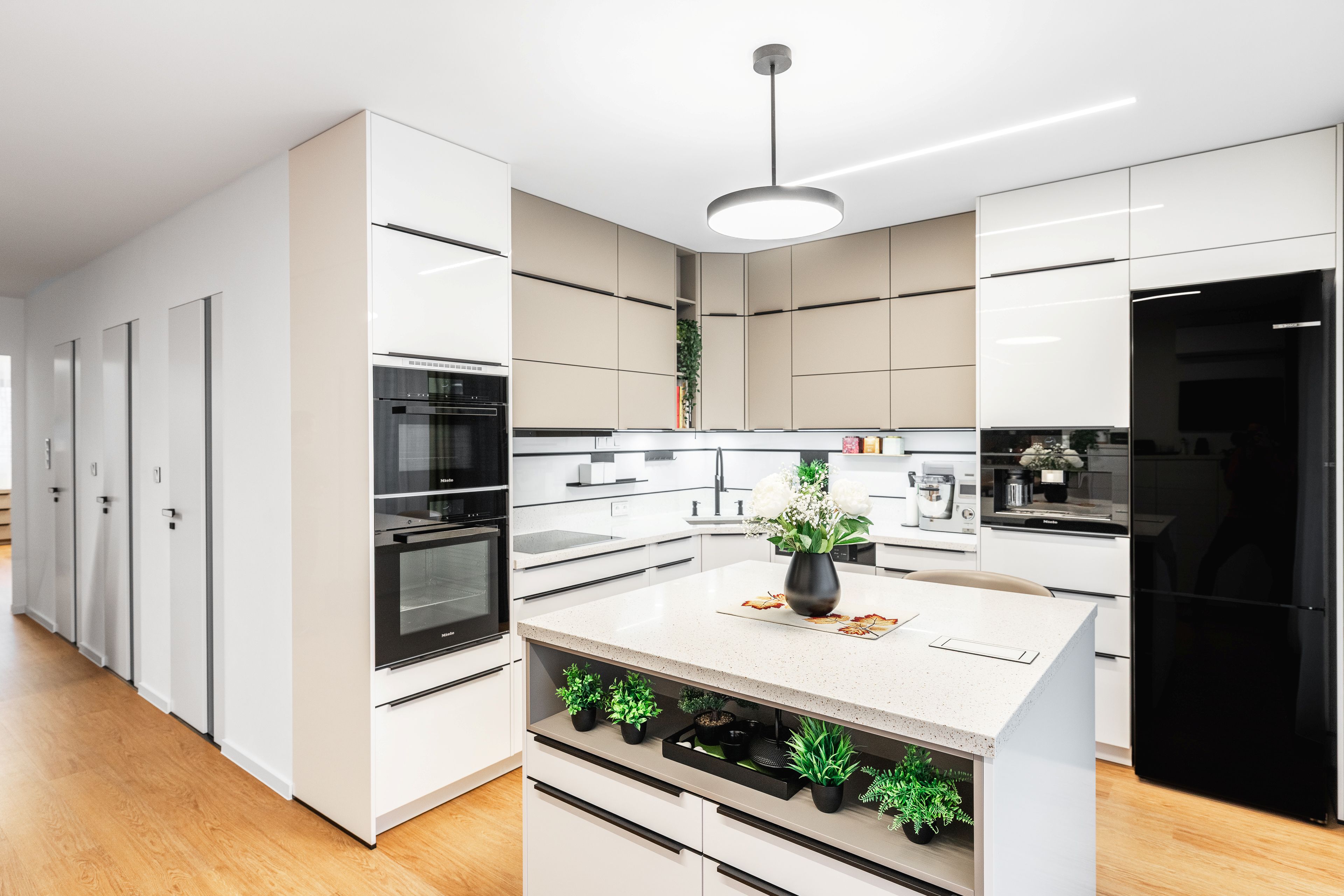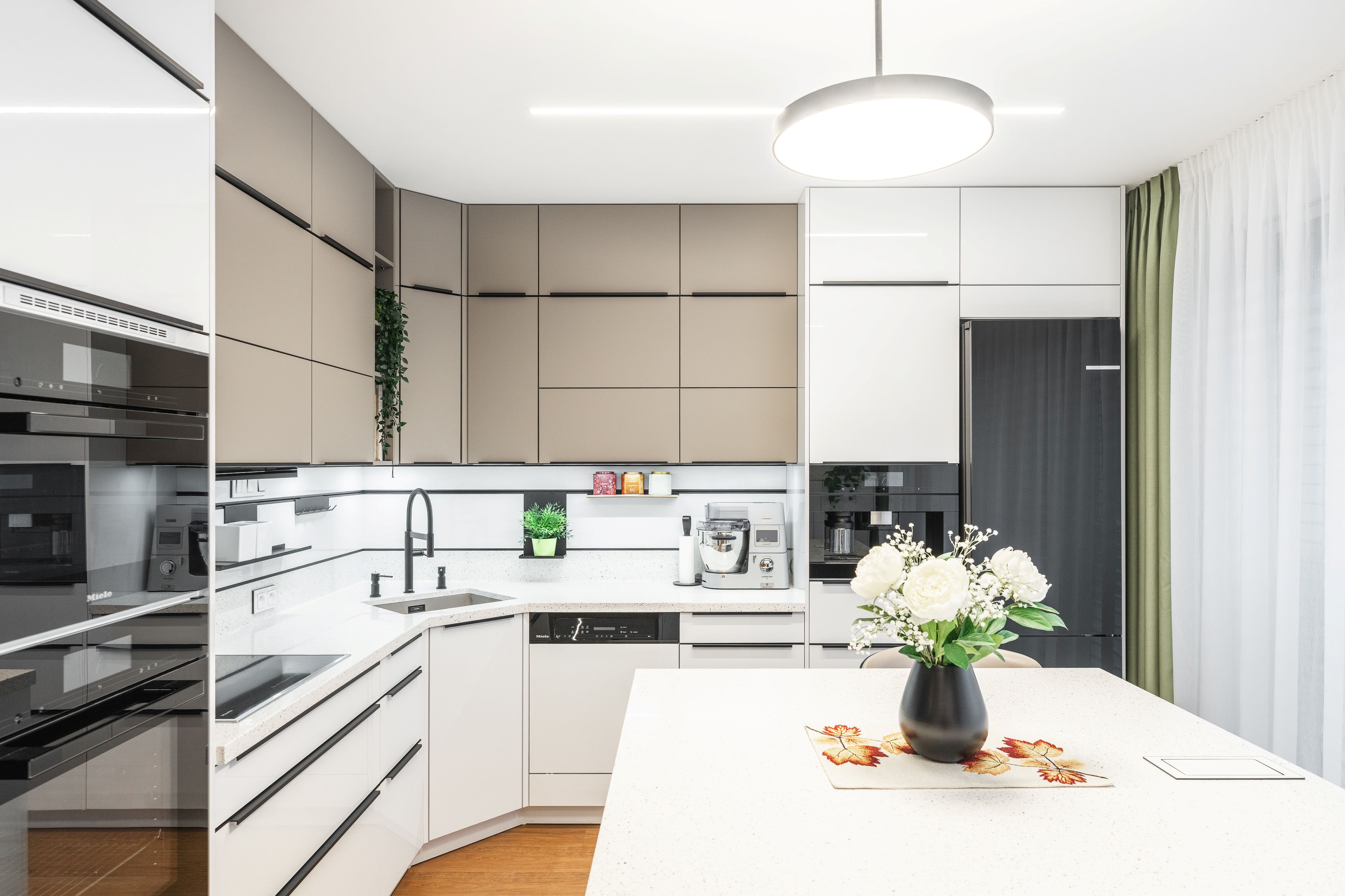 Kuchyně je vybavena exkluzivní řadou vestavných spotřebičů zn. Miele, lednice je volně stojící v černé matné povrchové úpravě.