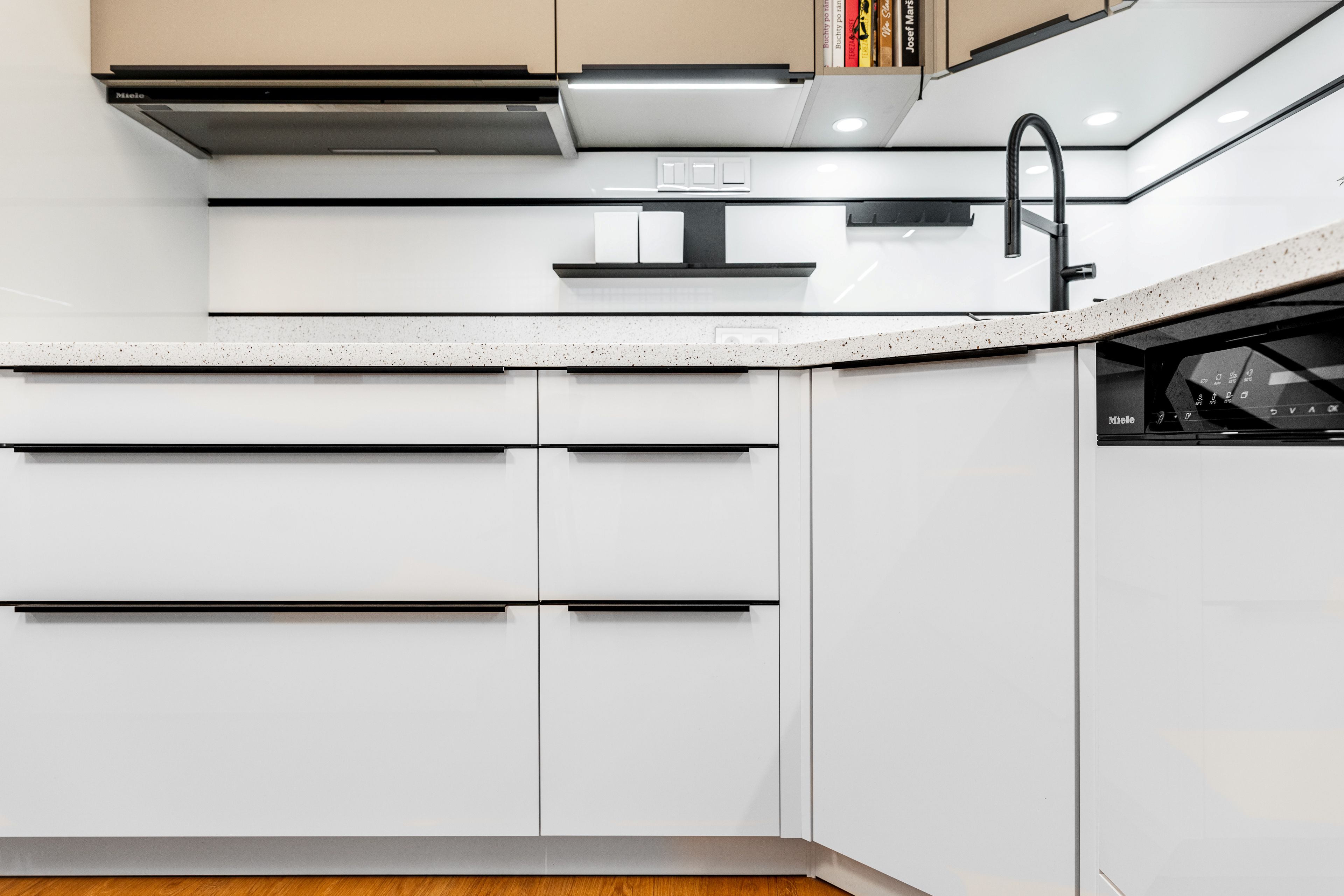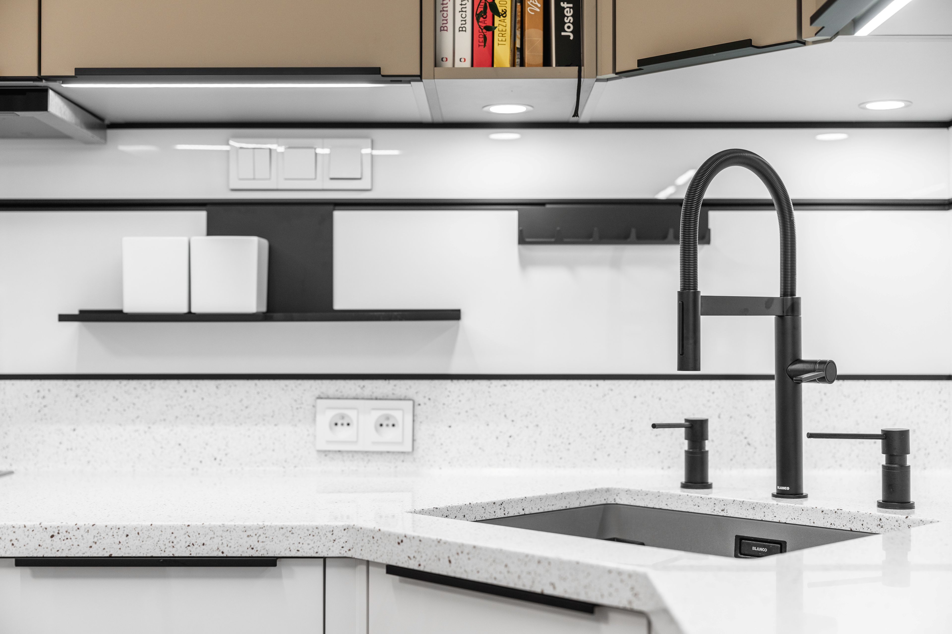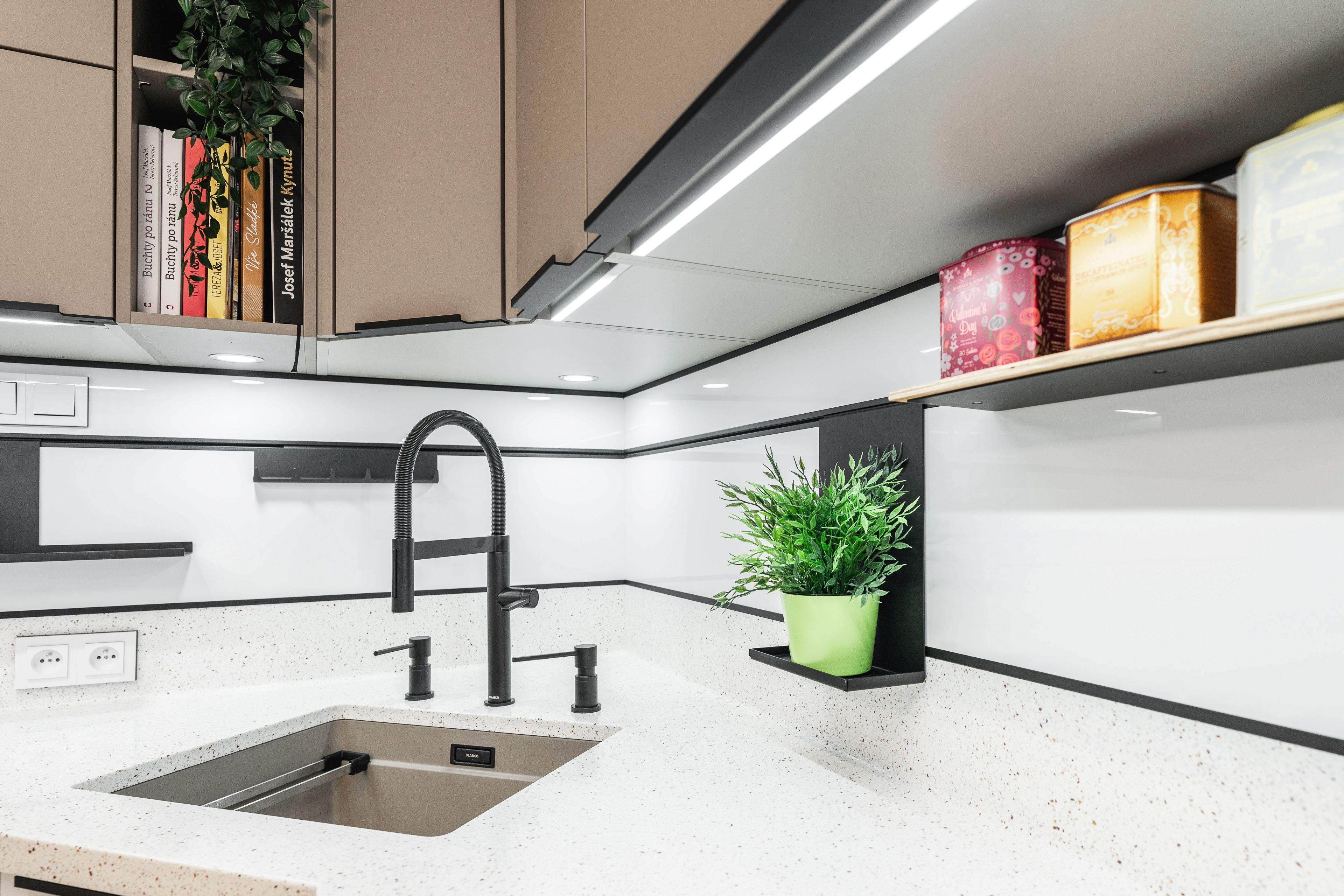 V tomto případě byla deska vytažená i jako částečná zástěna - obložení stěny. Ve shodné tloušťce pak na ni navazuje zadní obkladový panel systém od Schüller. S černými lištami, se závěsným praktickým doplňkovým systémem.