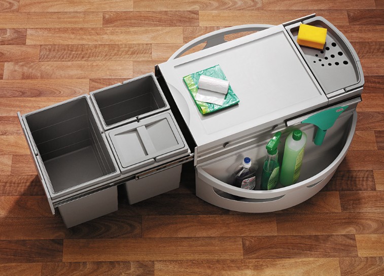 V diagonální rohové skříňce se dřezem je umístěný otočný sorter s odkládacími místy pro čistící přípravky a i kbelíkem na umývání podlahy.