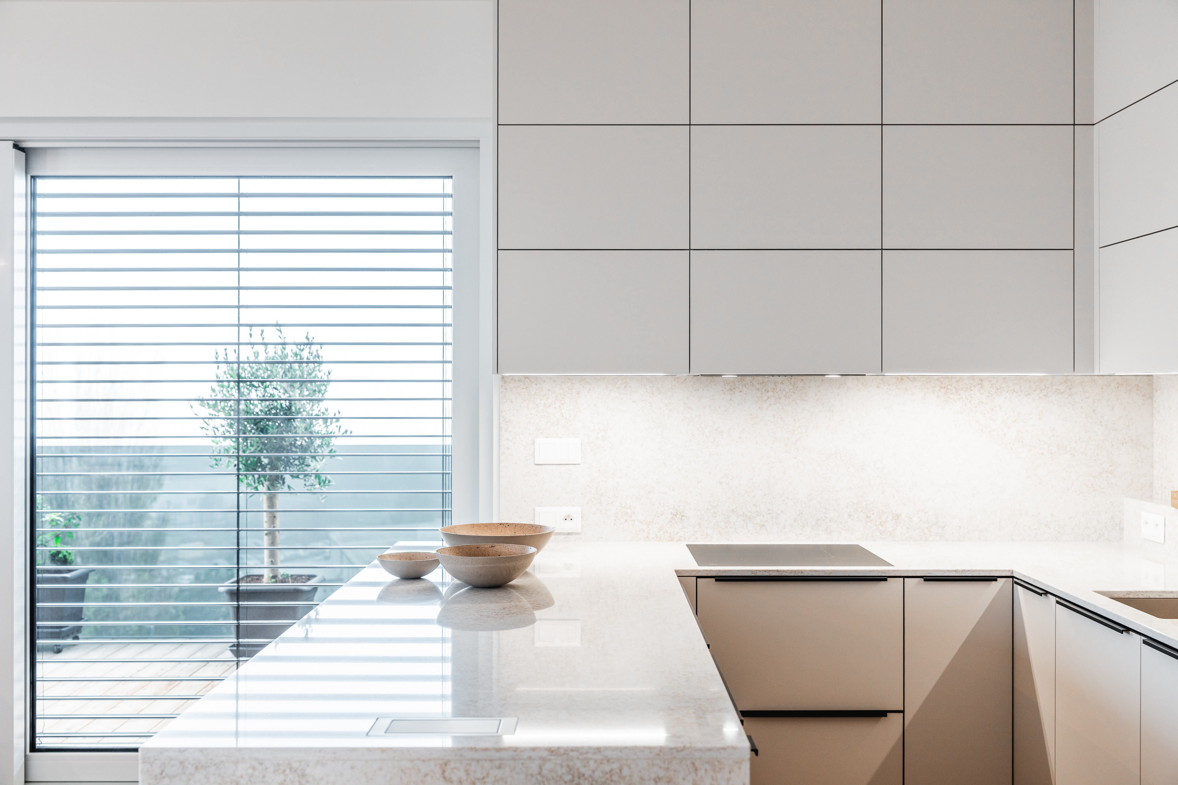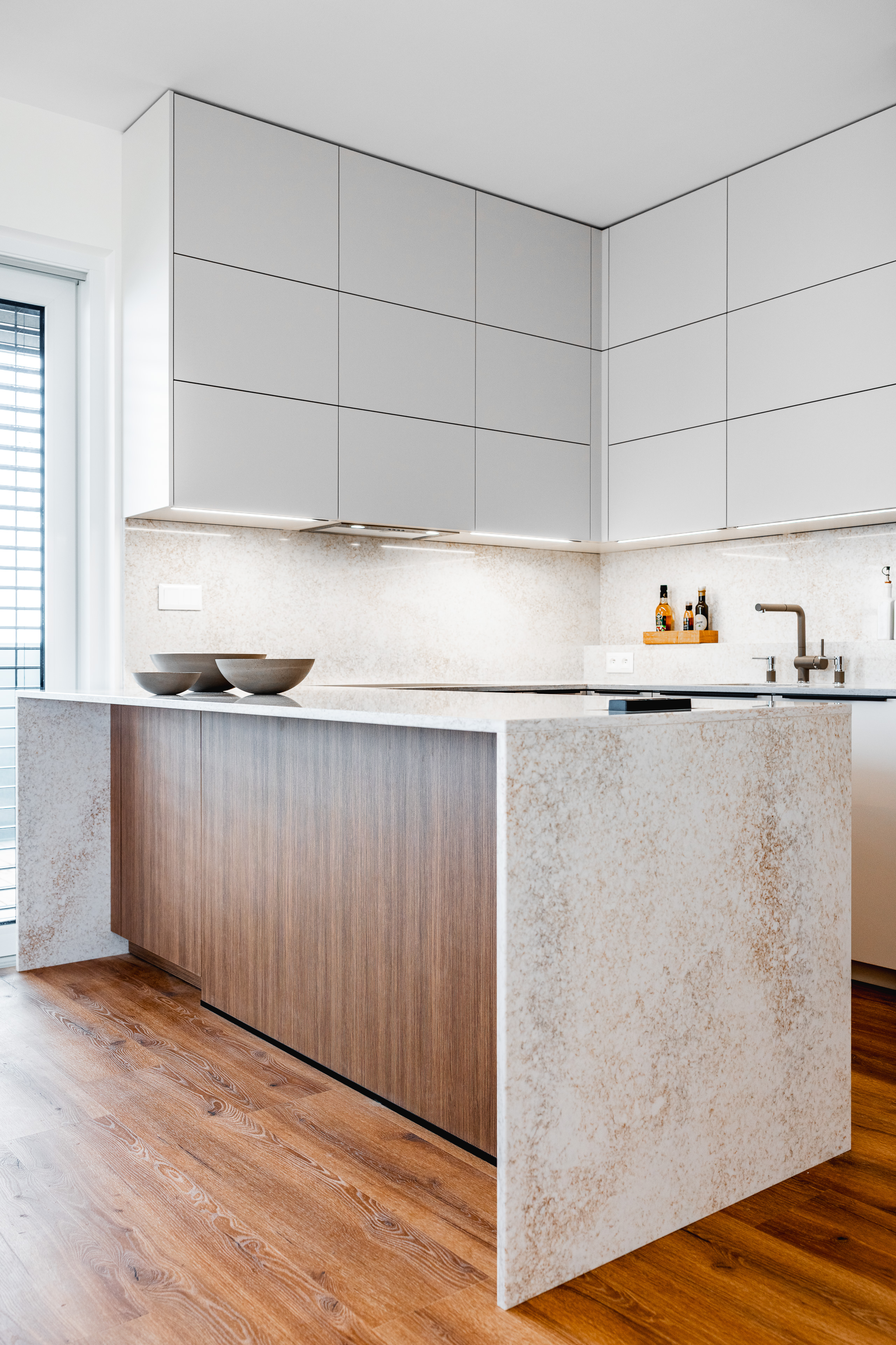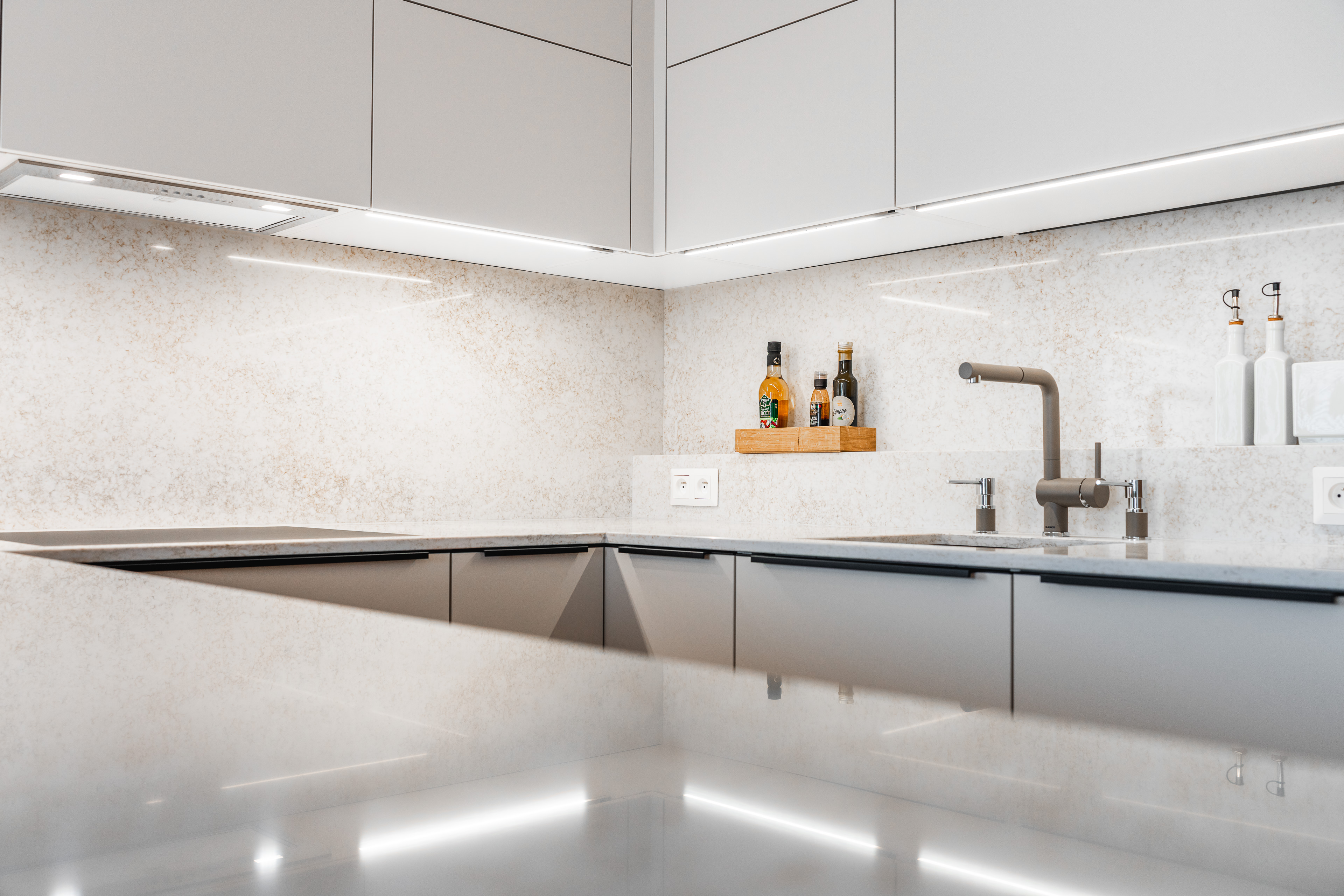 Pracovní deska a zadní obklad z materiálu Technistone v tl. 20 mm. Za zmínku stojí zvýšený schodeček na pracovní desce na odložení drobností, el. zásuvky jsou umístěné z čela schodečku.