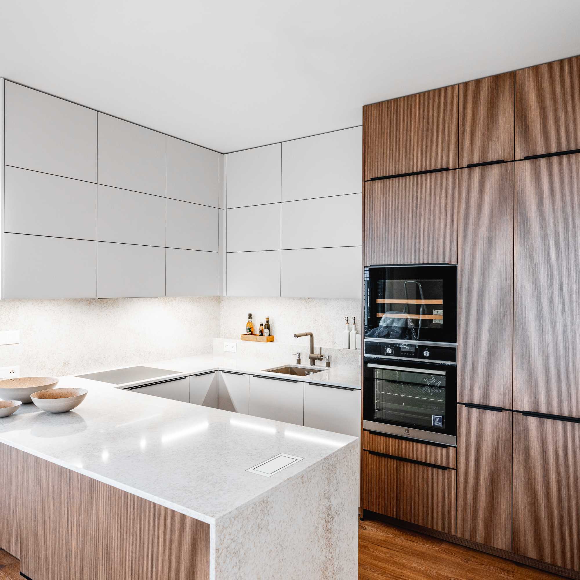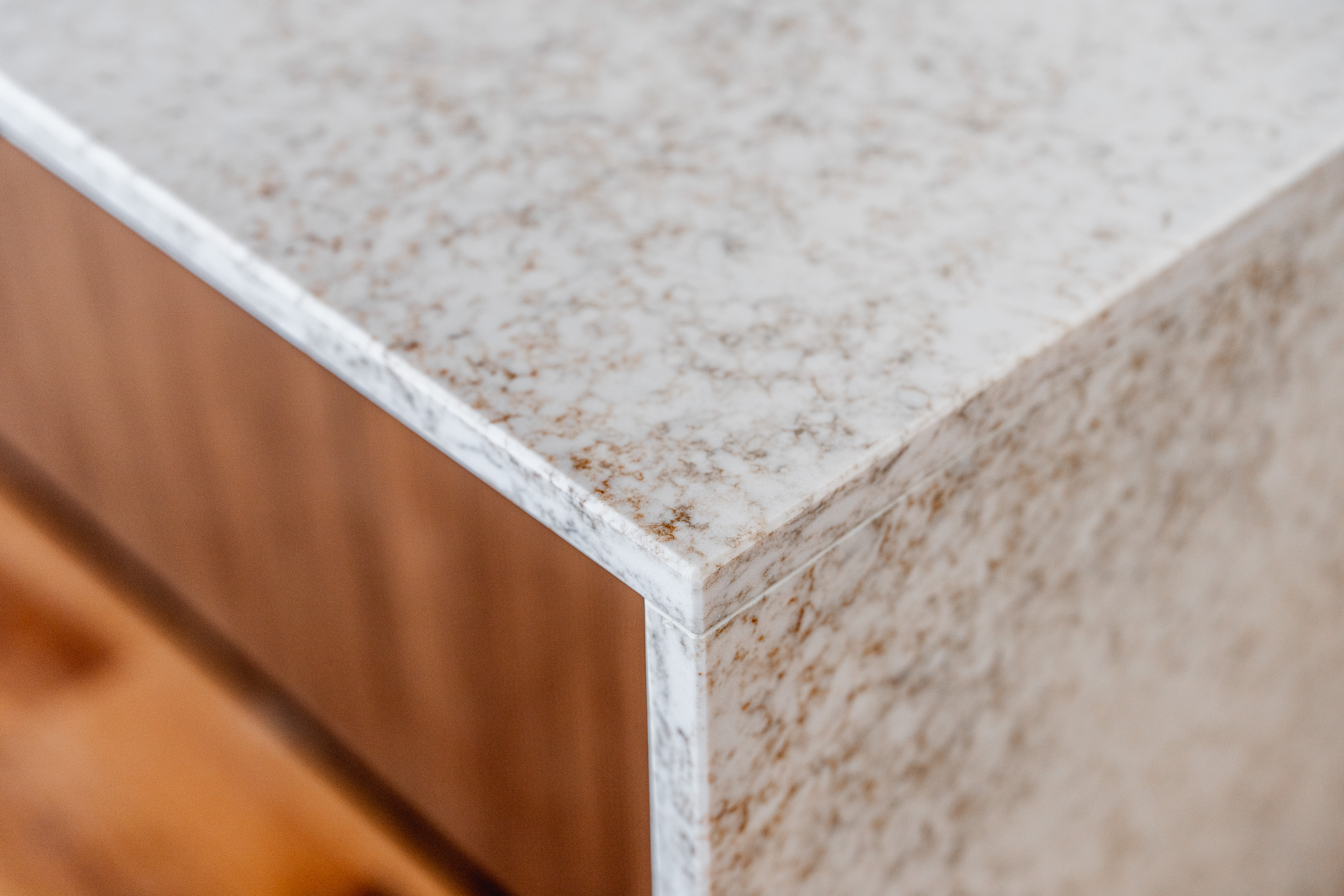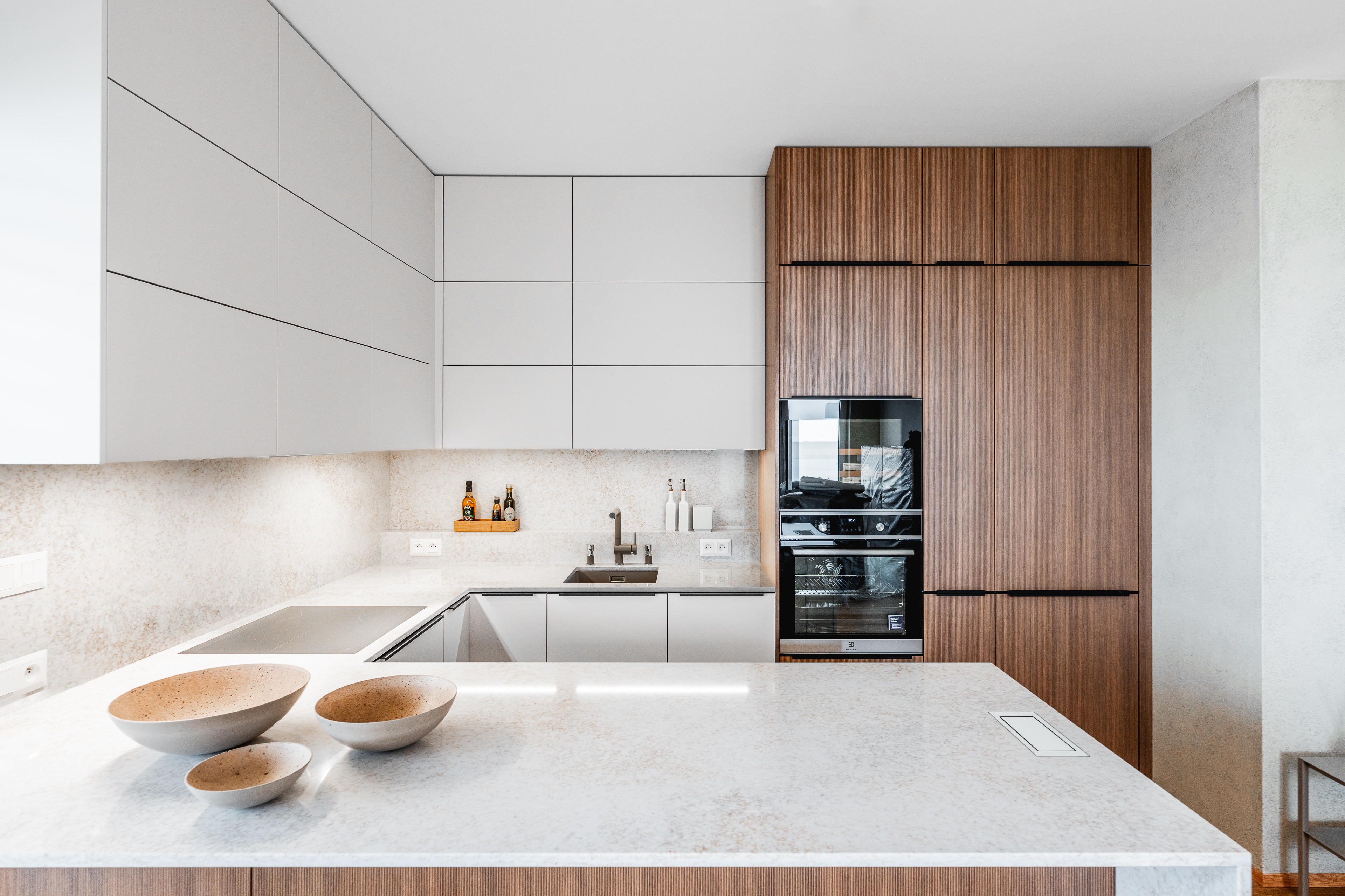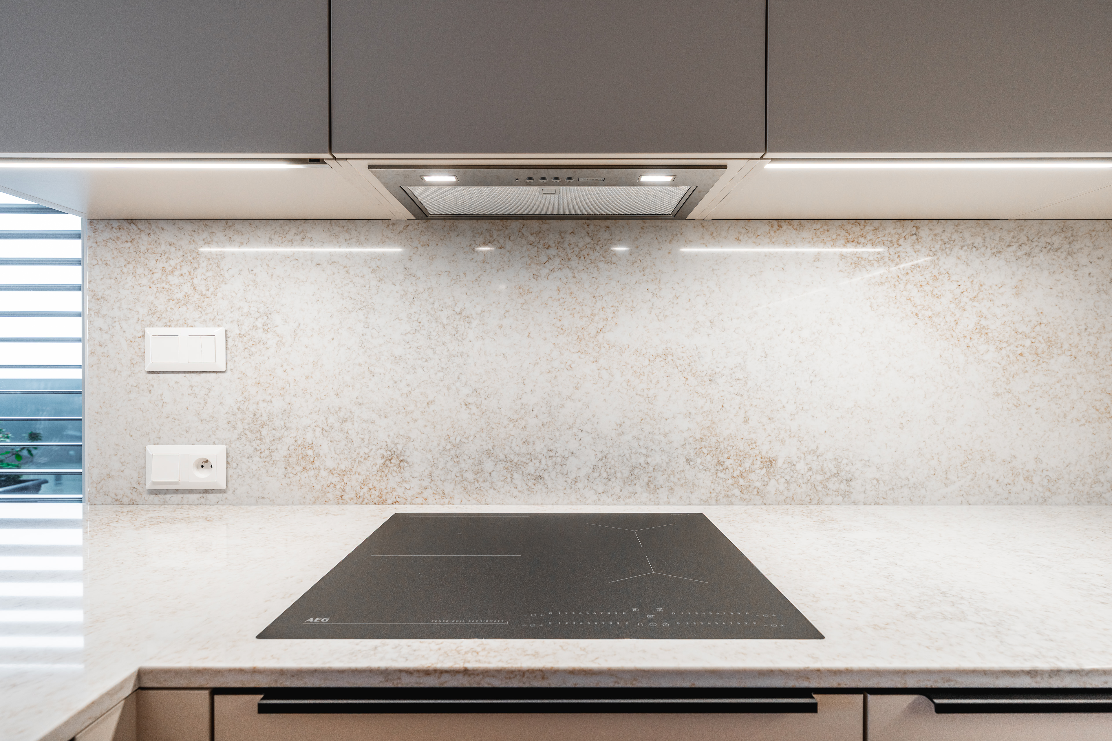 Pracovní deska a zadní obklad z materiálu Technistone v tl. 20 mm. Za zmínku stojí zvýšený schodeček na pracovní desce na odložení drobností, el. zásuvky jsou umístěné z čela schodečku.