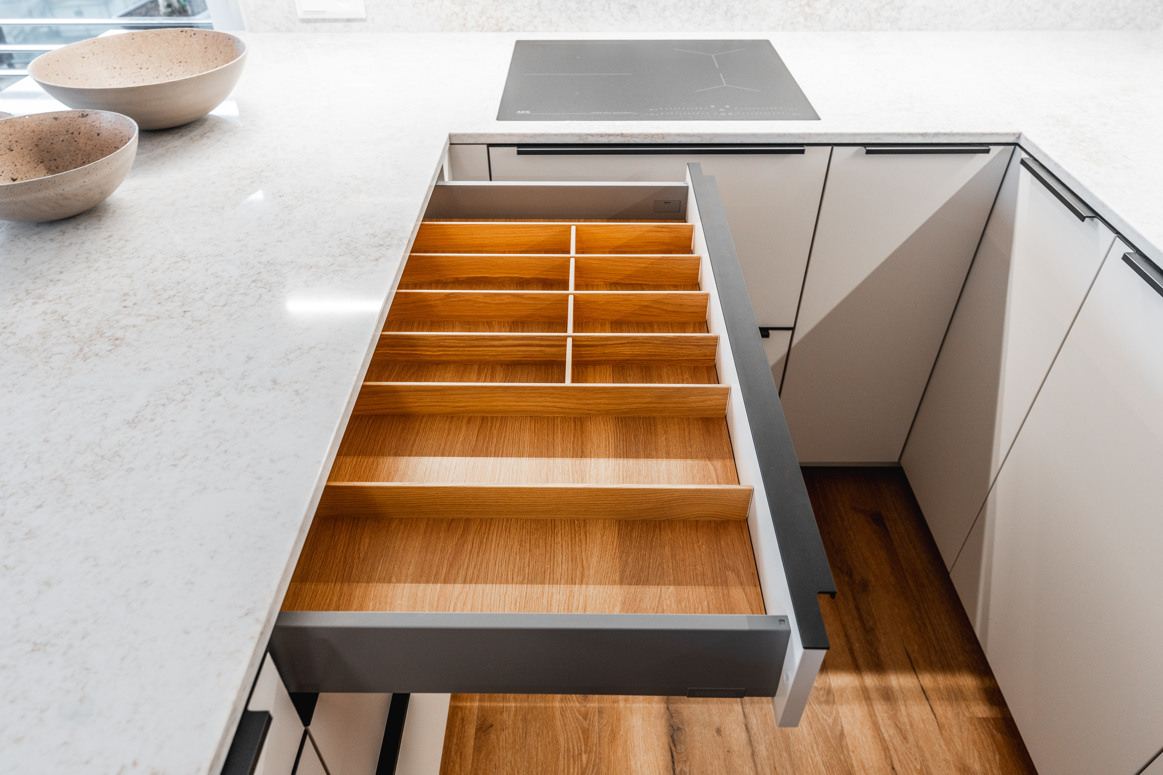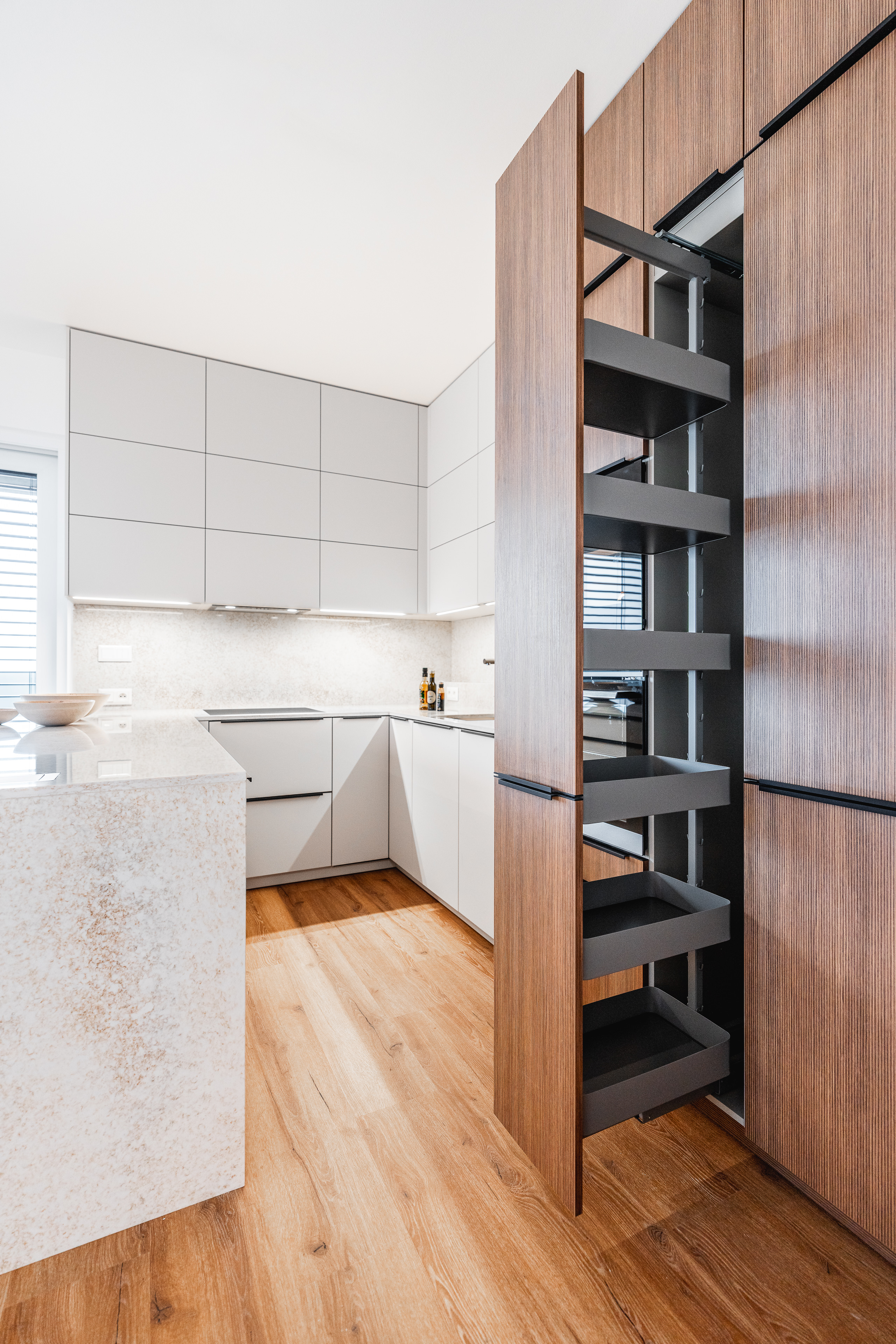 V kuchyni jsme potřebovali dostatek úložného prostoru a souvislou velkou pracovní plochu. V rohu máme otočný karusel, máme tam 15-ti cm s výsuvným systémem s košíkem a výsuvem na utěrky, skříňku s odpadkovým košem na tříděný odpad, šuplíky, dřezovou skříňku s přenosným systémem pro úklidové prostředky.