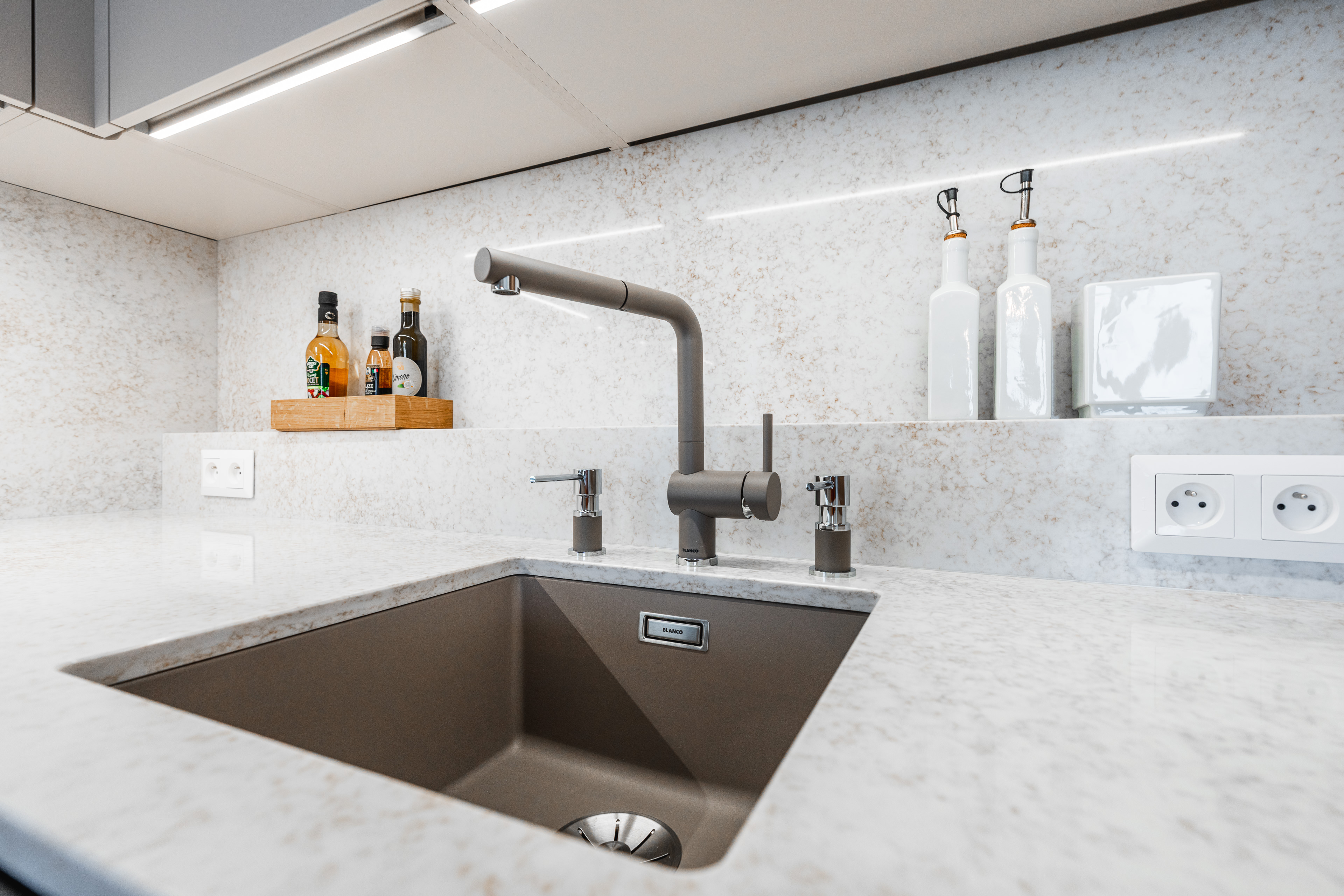 Dřez, baterie, dávkovače od firmy Blanco, v materiálu Silgranit