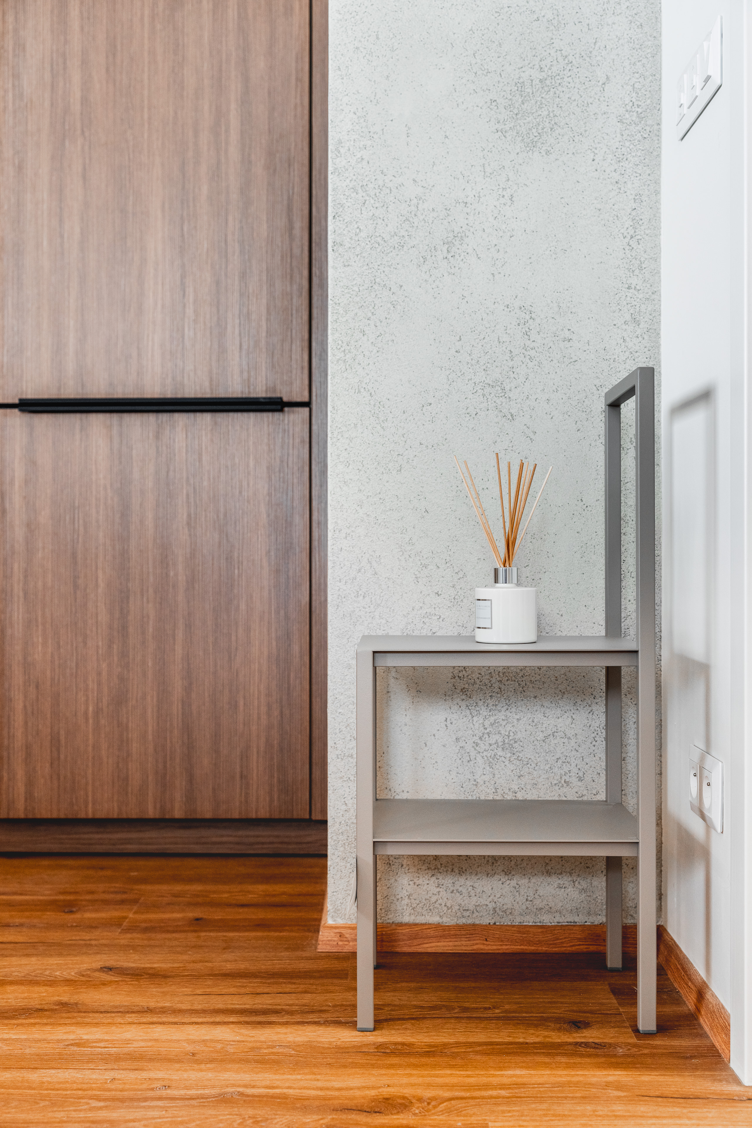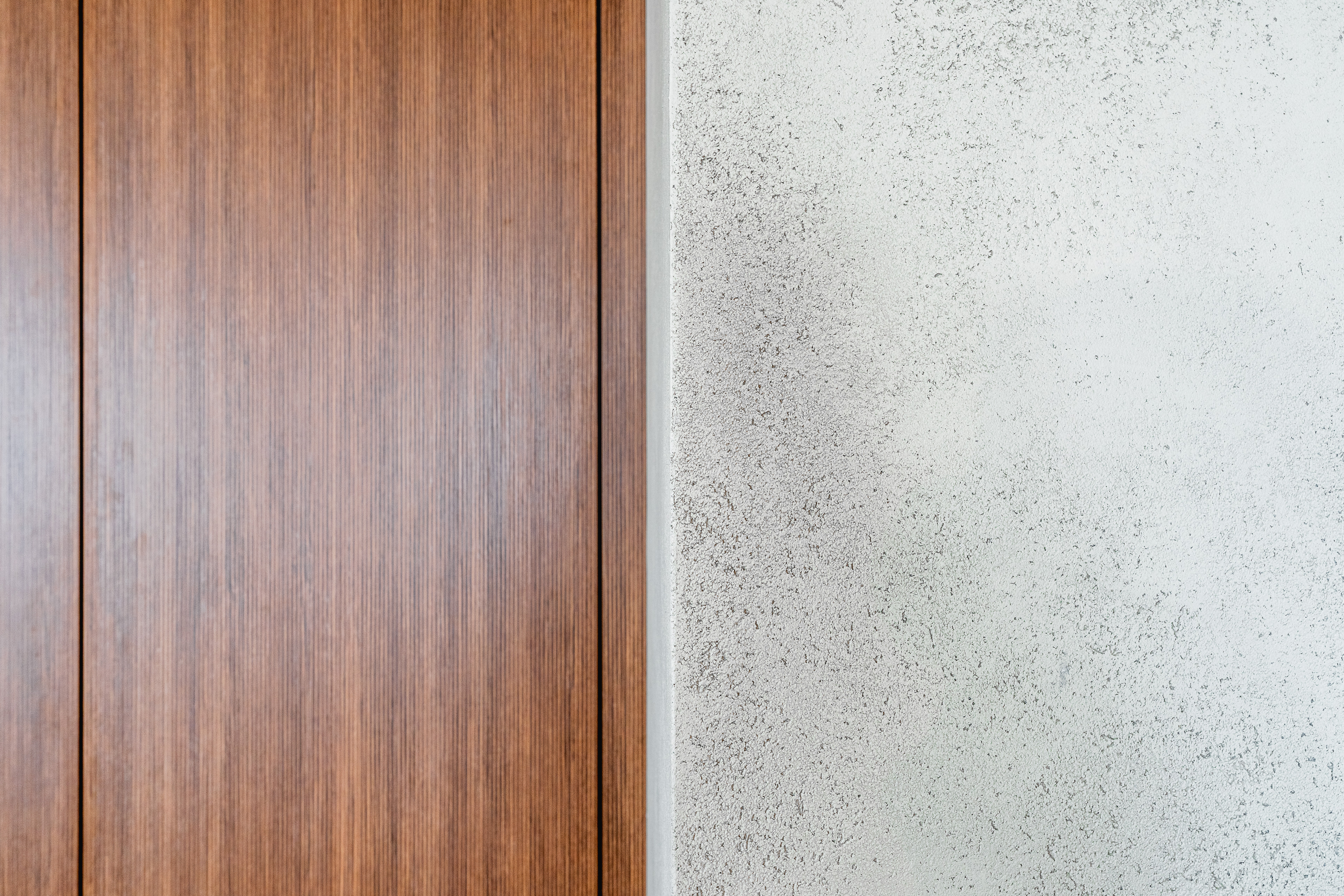 Moc hezkým a praktickým doplněním stěn je dekorační stěrka s broušeným efektem. Odstín jsme opět ladili na míru a tuto stěrku jsme použili i na stěnách v předsíni, v kuchyni a obýváku. Stěrka na stěnách je zalakovaná, výborná na údržbu.