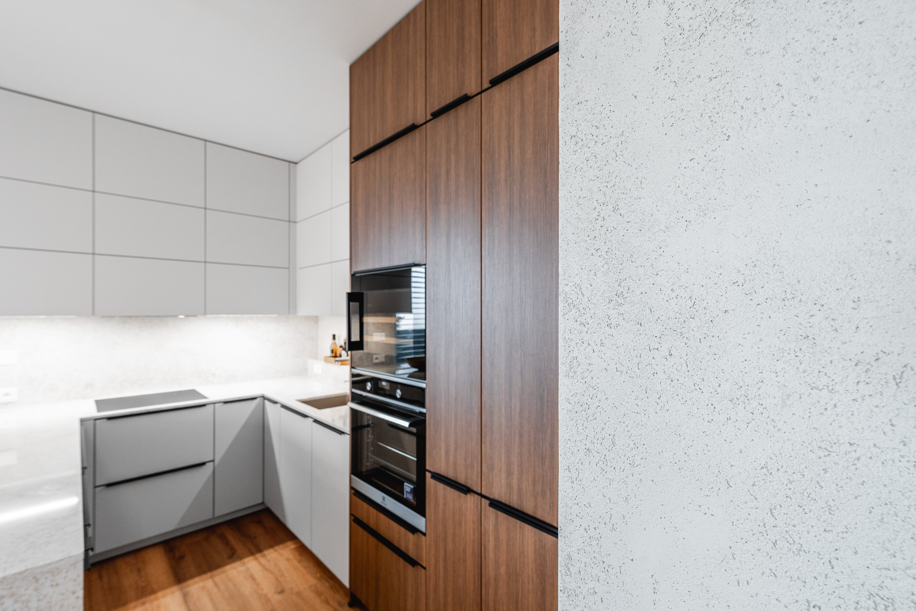 Sestava spodních a vysokých skříní s černými úchytkami umístěnými v hraně dveří. Horní sestava skříněk je bezúchytková s výklopnými dvířky, až na odsávačovou skříňku, ta má dvířka otevíravá.