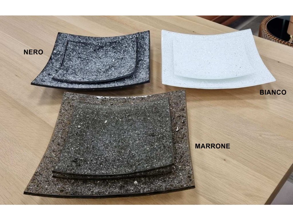 Skleněné tácy Piatto jsou v nabídce ve 2 rozměrech,  27x27cm a 20,5x20,5cm a ve 3 barevných provedeních (Marrone, Nero, Bianco).