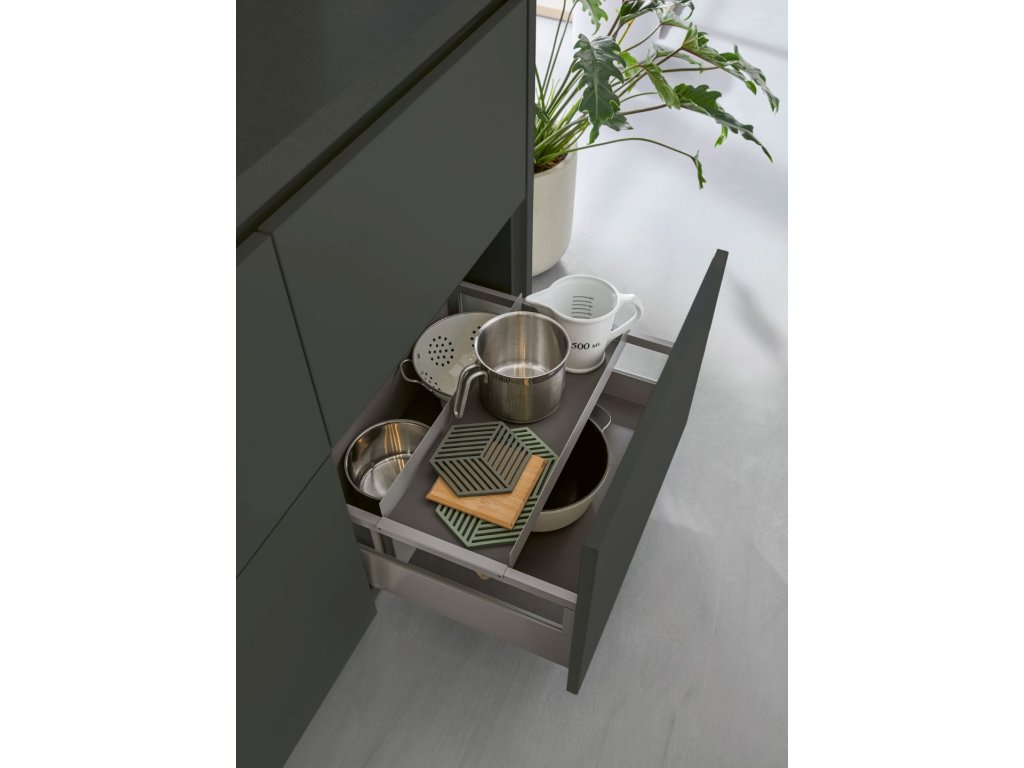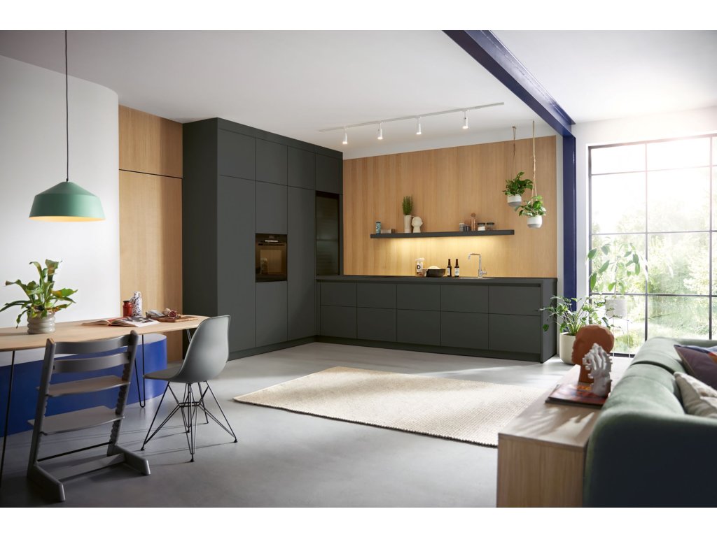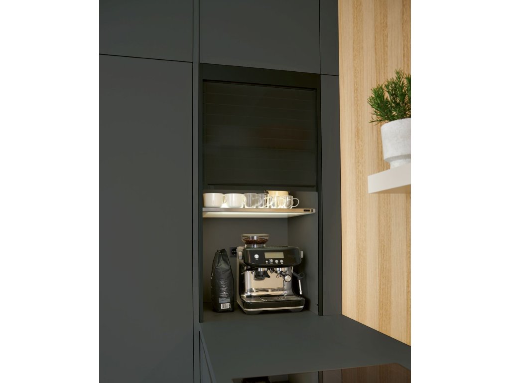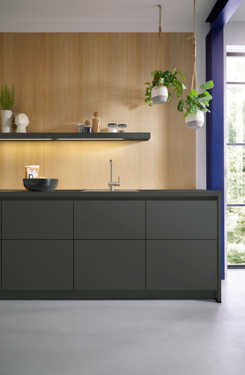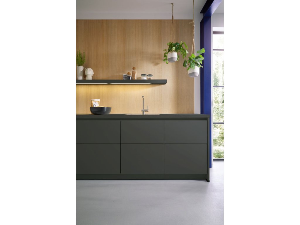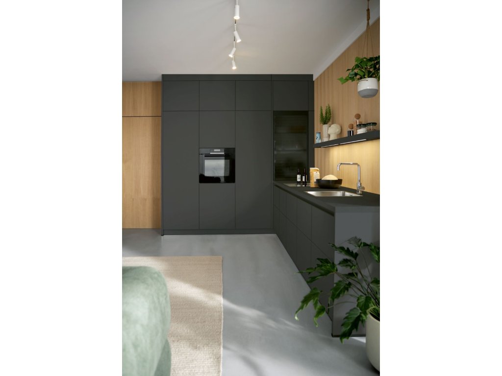 Antracitový odstín u kuchyně Matera AFP (dvířka UV lak matná) v provedení černé lávy je ukázkou stylově čistého, minimalistického řešení kuchyně. Dvířka v barvě antracitová (černé lávy - lava schwarz) v kombinaci s pracovní deskou ve stejné barvě vytvářejí jednotný a harmonický vzhled. To je zdůrazněno i novým systémem úchytek Single X. Jedna úchytková prohlubeň (GOLA) umístěná těsně pod pracovní deskou, další kuchyňská dvířka otevíravá pomocí TIP-ON nebo C-DRIVE. Design celistvých dvířek u vysokých skříní od podlahy až ke stropu (bez rozdělení) vytváří jednolitou plochu, dokonale decentní a vizuálně přitažlivou.