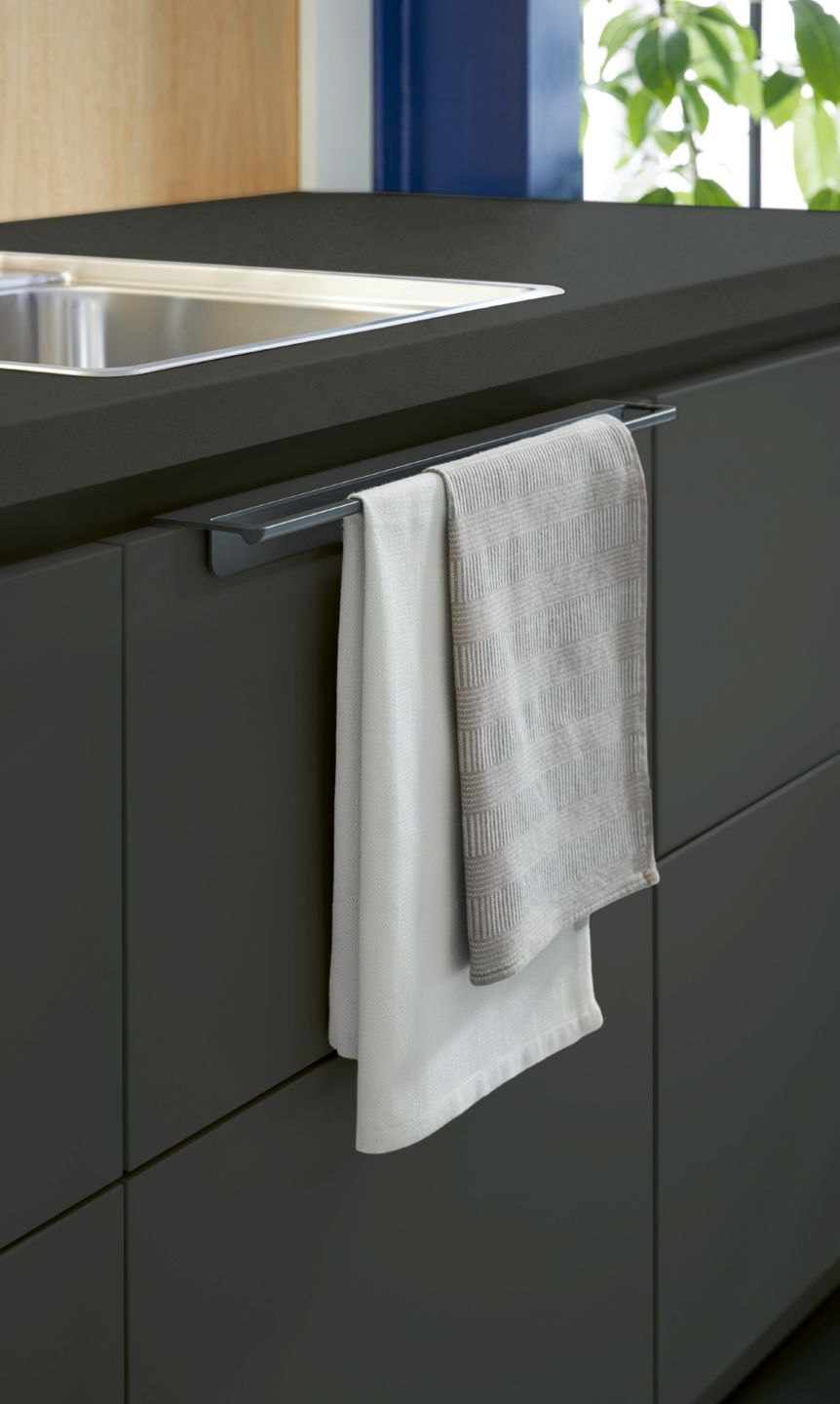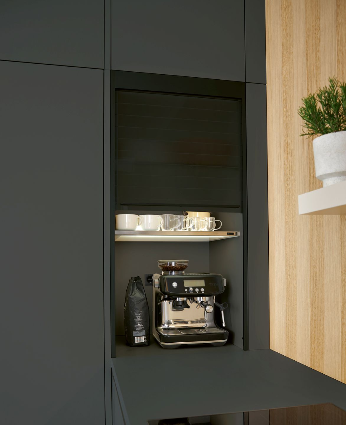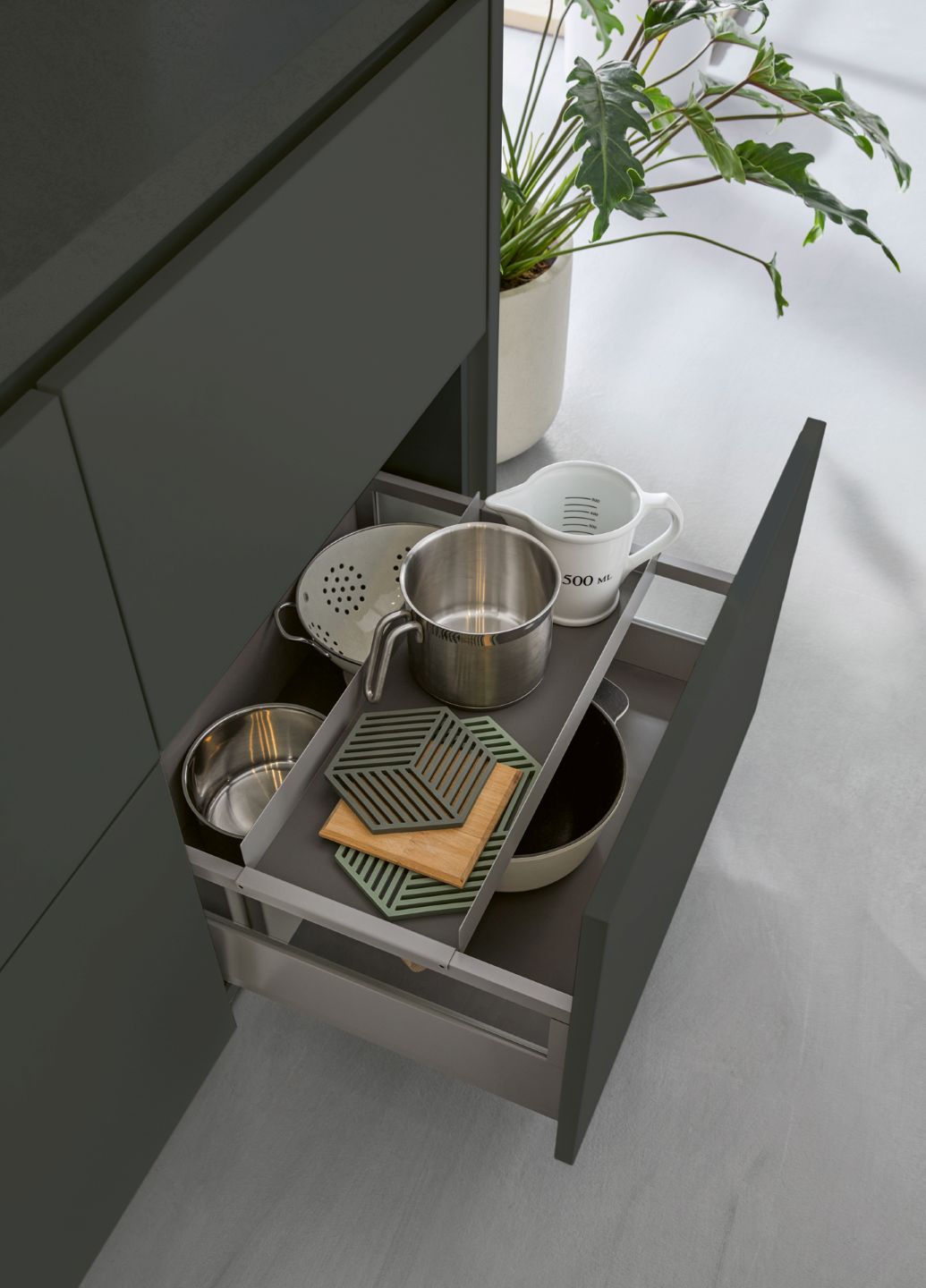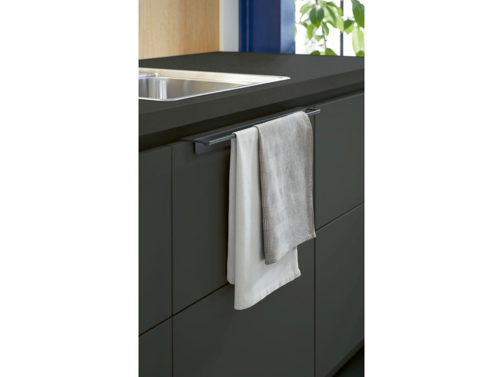 Antracitový odstín u kuchyně Matera AFP (dvířka UV lak matná) v provedení černé lávy je ukázkou stylově čistého, minimalistického řešení kuchyně. Dvířka v barvě antracitová (černé lávy - lava schwarz) v kombinaci s pracovní deskou ve stejné barvě vytvářejí jednotný a harmonický vzhled. To je zdůrazněno i novým systémem úchytek Single X. Jedna úchytková prohlubeň (GOLA) umístěná těsně pod pracovní deskou, další kuchyňská dvířka otevíravá pomocí TIP-ON nebo C-DRIVE. Design celistvých dvířek u vysokých skříní od podlahy až ke stropu (bez rozdělení) vytváří jednolitou plochu, dokonale decentní a vizuálně přitažlivou.