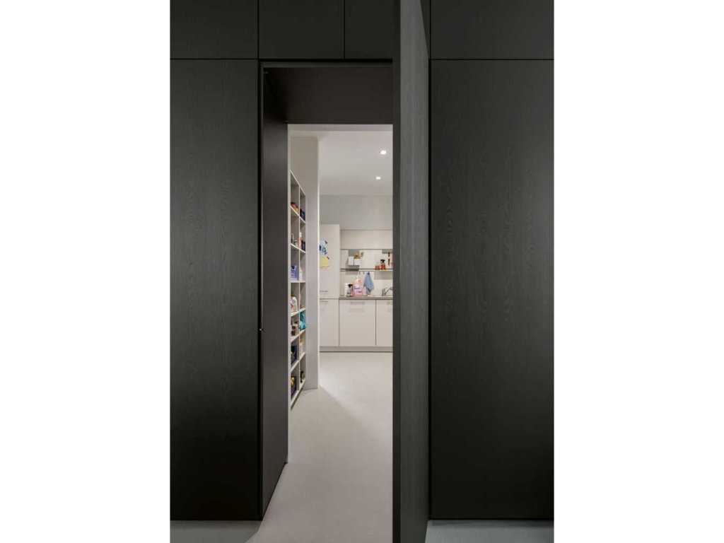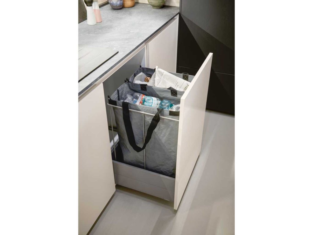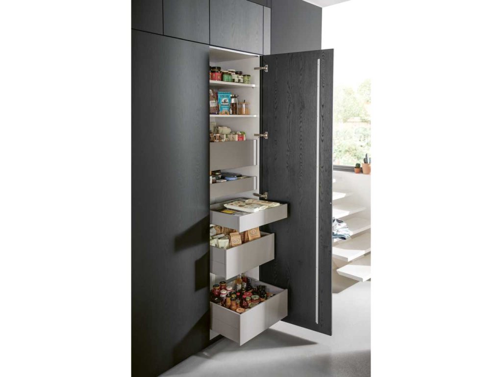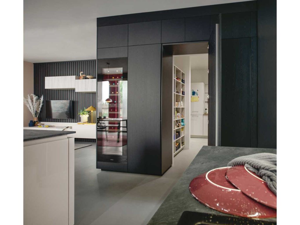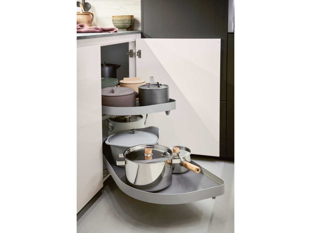 - Kombinace čel: Vysoce lesklý lakovaný laminát Uni Gloss P096 Mušle bílá (spodní skříňky) a dřevodekor Avola L772U AFP dub onyx černý (horní a vysoké skříňky)