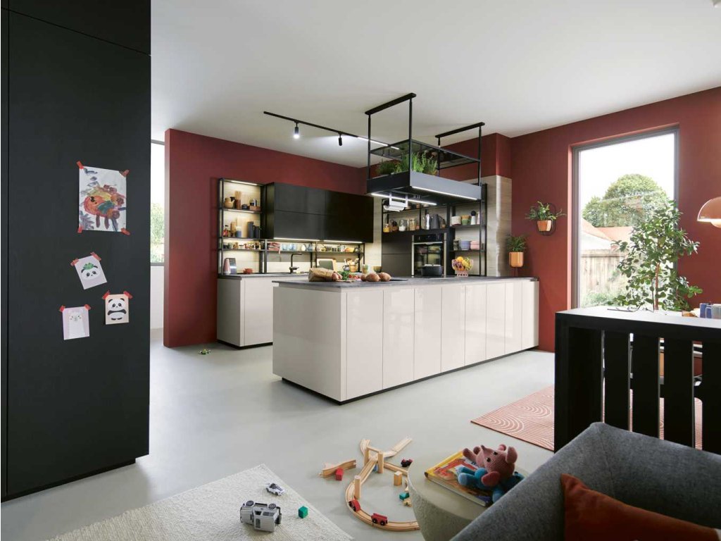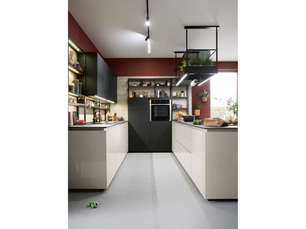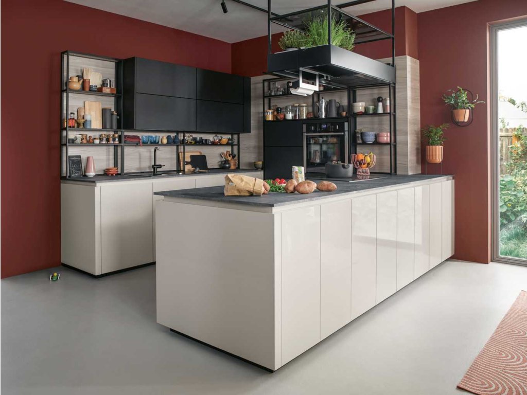 Kuchyně kombinující provedení lesklého lakovaného laminátu Uni Gloss v odstínu mušle bílé ve vysokém lesku a dřevodekoru Avola s AFP (AntiFinger Print lakovanou úpravou povrchu dvířek) v odstínu dub onyx černý, doplněná o otevřený policový kovový systém Frame Rack.
