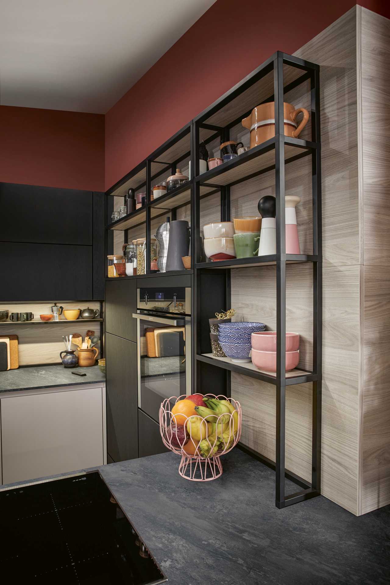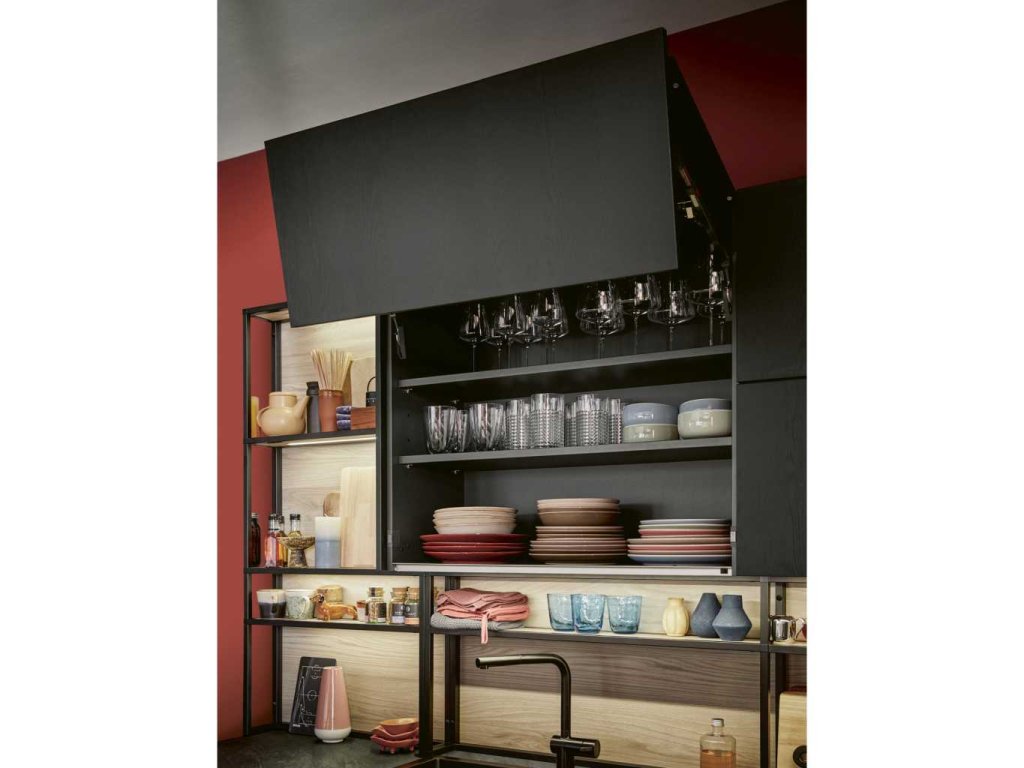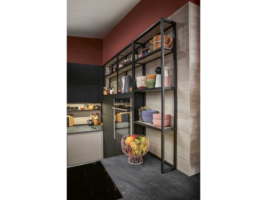 - využití kovových policových regálů Frame Rack mezi horními skříňkami a pracovní deskou