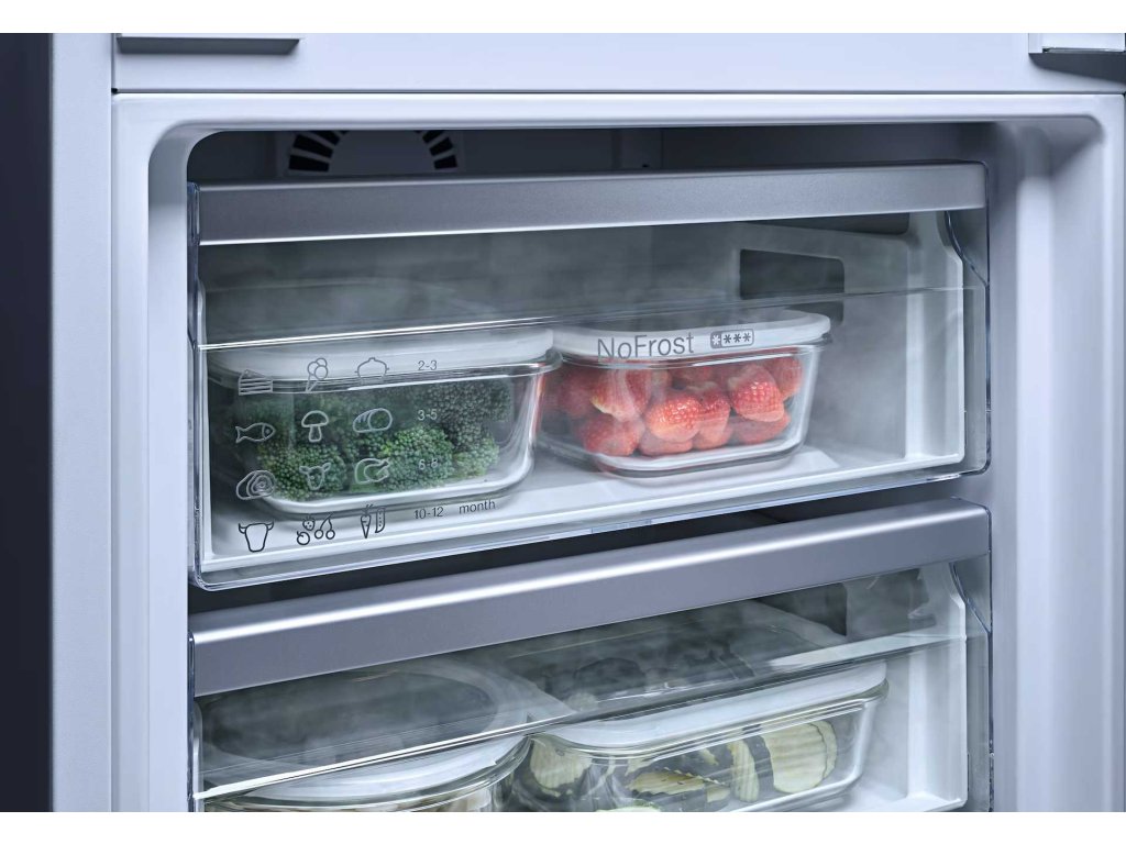 - NoFrost (Se systémem NoFrost nebudete muset svou mrazničku Miele již nikdy odmrazovat. Cirkulační chlazení rozvádí chladný suchý vzduch rovnoměrně ve vnitřním prostoru tak, že se zde nemůže tvořit žádný led. Zmražené potraviny se tak nepokryjí ledem a zásuvky lze vždy otevírat a zavírat snadno bez rušivé námrazy. Díky tomu nabízí systém NoFrost maximální komfort při mražení a navždy vás zbaví nepříjemného odmrazování)